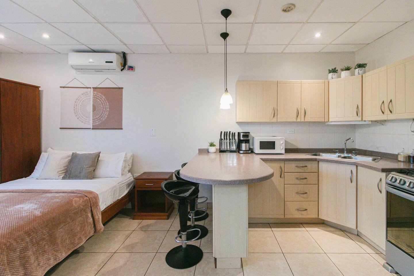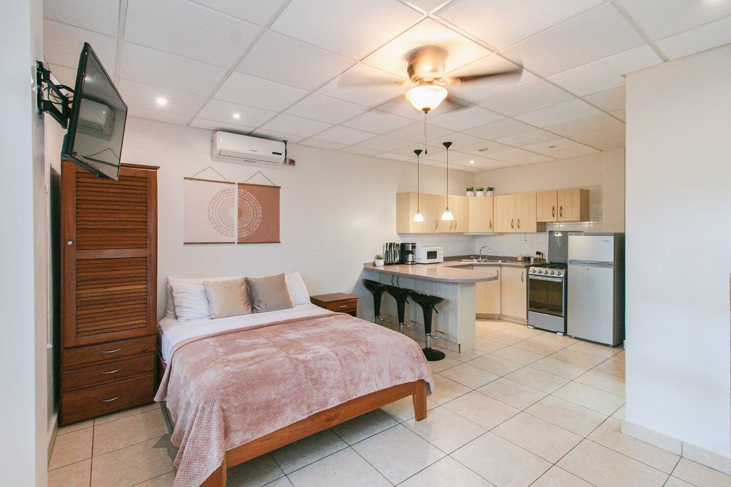 Located in Bocas Condos, this cozy ground-floor studio is perfect for couples or solo travelers. Privately owned and personally cared for, it offers a warm, comfortable base in town. • Queen bed, A/C, Starlink Wi-Fi, Netflix & hot water • Fully equipped kitchen + cozy private patio • Walk to cafés, boat taxis & Bolivar Park • Guest perks: Exclusive discounts at partner businesses in Bocas!
